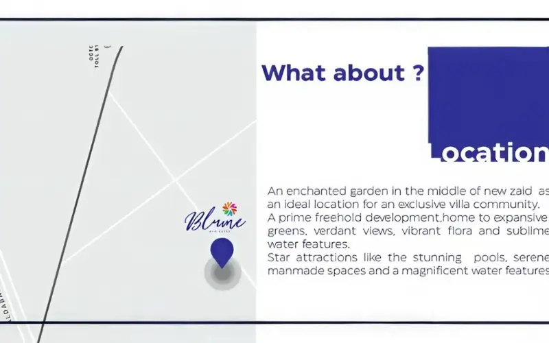 كمبوند بلوم الشيخ زايد Blume Sheikh Zayed هو مشروع سكني حديث ويقع في الحوض رقم 2 بمنطقة الحزام الأخضر في زادي الجديدة بمدينة الشيخ زايد، ويعرف بتصميمه المعماري العصري الحديث والمخطط السكني الراقي الذي يتناسب مع العائلات الباحثة عن جودة الحياة الهادئة وبالقرب من كافة الخدمات الأساسية والترفيهية، وتم تطوير المشروع على أيدي شركة العمران للتطوير العقاري، وهي من الشركات المعروفة في السوق العقاري المصري، حيث نفذت المشروعات السابقة مثل الارا وبالم جيت في نفس المنطقة، مما يضمن للعملاء مستوي جودة مميز.