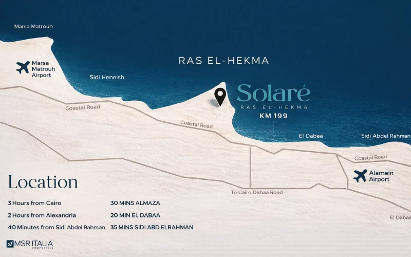 اختارت مصر إيطاليا العقارية موقعا مميزا لمشروعها الجديد في رأس الحكمة، وبالتحديد في الكيلو 199 من طريق الإسكندرية – مطروح الصحراوي، الأمر الذي يسهل مهمة الوصول إلى المشروع عبر شبكة الطرق السريعة، أو من خلال القرى السياحية المجاورة.