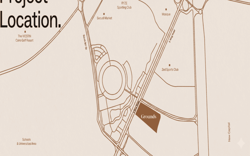 ONE/ONE chose the location of Grounds Compound in the 6th Settlement, New Cairo, with clear awareness. The project is located directly on the Outer Ring Road in an area surrounded by strong names such as Kattameya Dunes, Mivida, ZED Sports Club, and The Westin Cairo Golf Resort. This means that the resident in Grounds 6th Settlement lives within a fully functional service scope from day one.